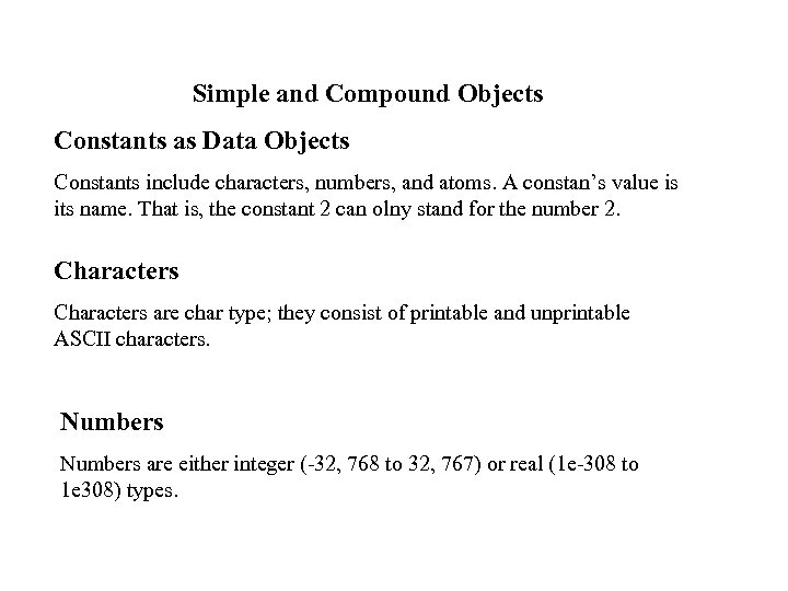 Simple and Compound Objects Constants as Data Objects Constants include characters, numbers, and atoms. A constan’s value is its name. That is, the constant 2 can olny stand for the number 2. Characters are char type; they consist of printable and unprintable ASCII characters. Numbers are either integer (-32, 768 to 32, 767) or real (1 e-308 to 1 e 308) types.