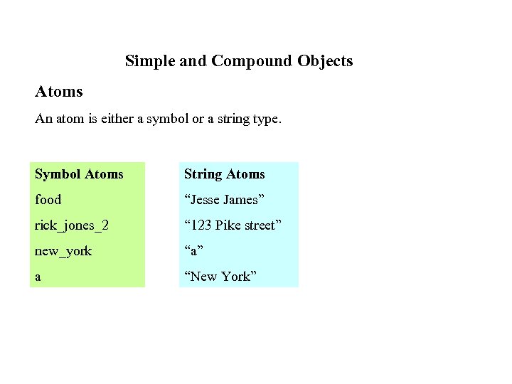 Simple and Compound Objects Atoms An atom is either a symbol or a string type. Symbol Atoms String Atoms food “Jesse James” rick_jones_2 “ 123 Pike street” new_york “a” a “New York”
