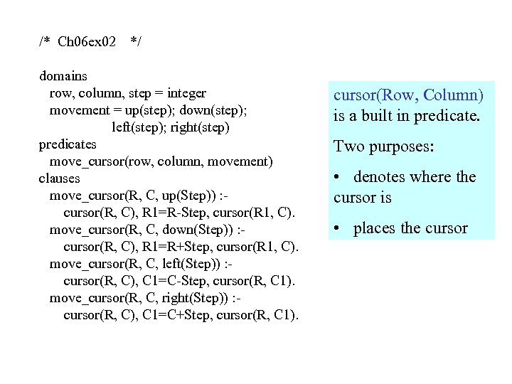 /* Ch 06 ex 02 */ domains row, column, step = integer movement = up(step); down(step); left(step); right(step) predicates move_cursor(row, column, movement) clauses move_cursor(R, C, up(Step)) : cursor(R, C), R 1=R-Step, cursor(R 1, C). move_cursor(R, C, down(Step)) : cursor(R, C), R 1=R+Step, cursor(R 1, C). move_cursor(R, C, left(Step)) : cursor(R, C), C 1=C-Step, cursor(R, C 1). move_cursor(R, C, right(Step)) : cursor(R, C), C 1=C+Step, cursor(R, C 1). cursor(Row, Column) is a built in predicate. Two purposes: • denotes where the cursor is • places the cursor