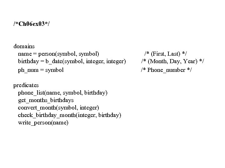 /*Ch 06 ex 03*/ domains name = person(symbol, symbol) birthday = b_date(symbol, integer) ph_num = symbol predicates phone_list(name, symbol, birthday) get_months_birthdays convert_month(symbol, integer) check_birthday_month(integer, birthday) write_person(name) /* (First, Last) */ /* (Month, Day, Year) */ /* Phone_number */