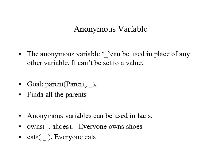 Anonymous Variable • The anonymous variable ‘_’can be used in place of any other variable. It can’t be set to a value. • Goal: parent(Parent, _). • Finds all the parents • Anonymous variables can be used in facts. • owns(_, shoes). Everyone owns shoes • eats( _ ). Everyone eats