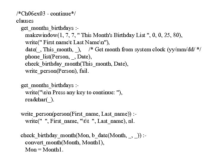 /*Ch 06 ex 03 - continue*/ clauses get_months_birthdays : makewindow(1, 7, 7, " This Month's Birthday List ", 0, 0, 25, 80), write(" First namet Last Namen"), date(_, This_month, _), /* Get month from system clock (yy/mm/dd/ */ phone_list(Person, _, Date), check_birthday_month(This_month, Date), write_person(Person), fail. get_months_birthdays : write("nn Press any key to continue: "), readchar(_). write_person(First_name, Last_name)) : write(" ", First_name, "tt ", Last_name), nl. check_birthday_month(Mon, b_date(Month, _, _)) : convert_month(Month, Month 1), Mon = Month 1.