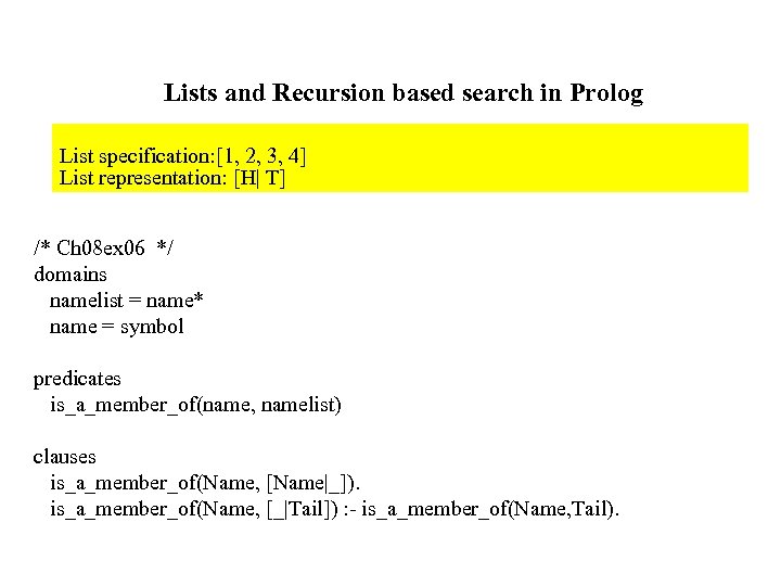 Lists and Recursion based search in Prolog List specification: [1, 2, 3, 4] List representation: [H| T] /* Ch 08 ex 06 */ domains namelist = name* name = symbol predicates is_a_member_of(name, namelist) clauses is_a_member_of(Name, [Name|_]). is_a_member_of(Name, [_|Tail]) : - is_a_member_of(Name, Tail).