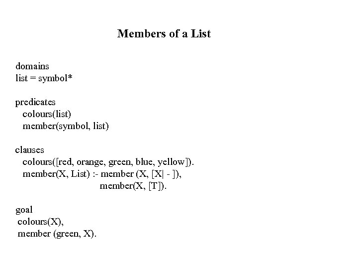 Members of a List domains list = symbol* predicates colours(list) member(symbol, list) clauses colours([red, orange, green, blue, yellow]). member(X, List) : - member (X, [X| - ]), member(X, [T]). goal colours(X), member (green, X).