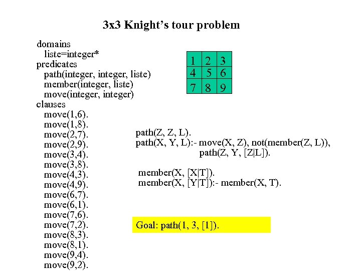 3 x 3 Knight’s tour problem domains liste=integer* 1 2 3 predicates 4 5 6 path(integer, liste) member(integer, liste) 7 8 9 move(integer, integer) clauses move(1, 6). move(1, 8). path(Z, Z, L). move(2, 7). path(X, Y, L): - move(X, Z), not(member(Z, L)), move(2, 9). path(Z, Y, [Z|L]). move(3, 4). move(3, 8). member(X, [X|T]). move(4, 3). member(X, [Y|T]): - member(X, T). move(4, 9). move(6, 7). move(6, 1). move(7, 6). move(7, 2). Goal: path(1, 3, [1]). move(8, 3). move(8, 1). move(9, 4). move(9, 2).