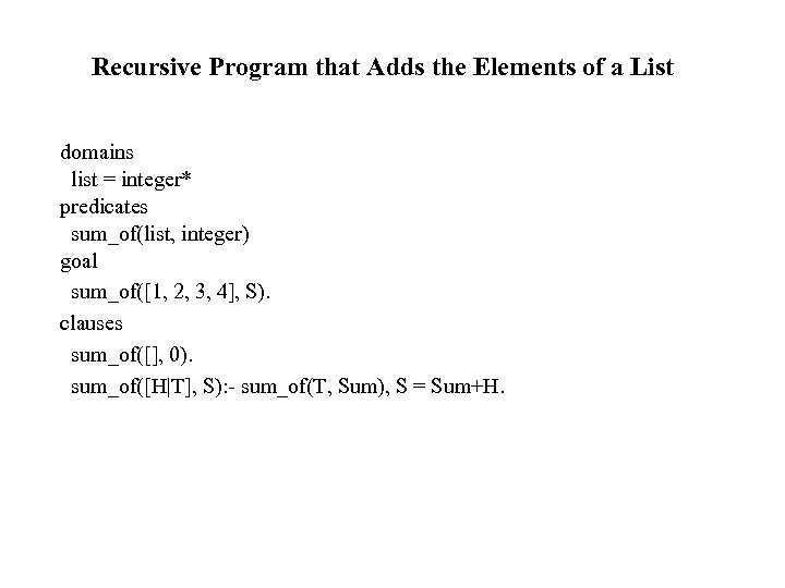 Recursive Program that Adds the Elements of a List domains list = integer* predicates sum_of(list, integer) goal sum_of([1, 2, 3, 4], S). clauses sum_of([], 0). sum_of([H|T], S): - sum_of(T, Sum), S = Sum+H.
