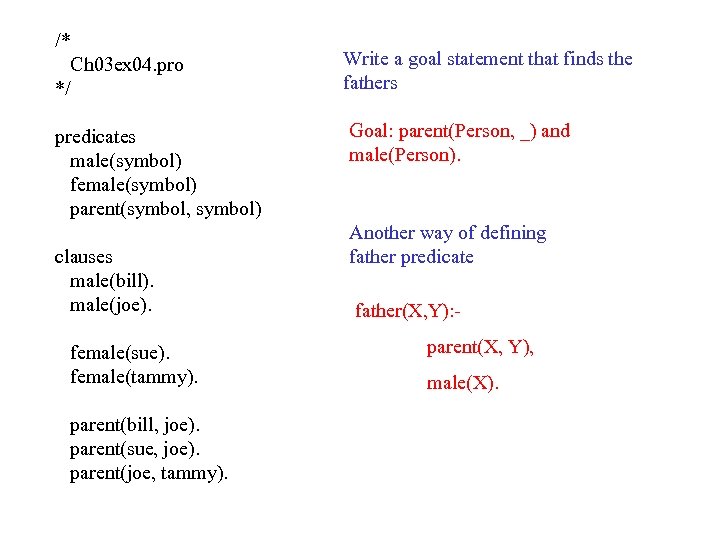 /* Ch 03 ex 04. pro */ predicates male(symbol) female(symbol) parent(symbol, symbol) clauses male(bill). male(joe). female(sue). female(tammy). parent(bill, joe). parent(sue, joe). parent(joe, tammy). Write a goal statement that finds the fathers Goal: parent(Person, _) and male(Person). Another way of defining father predicate father(X, Y): parent(X, Y), male(X).