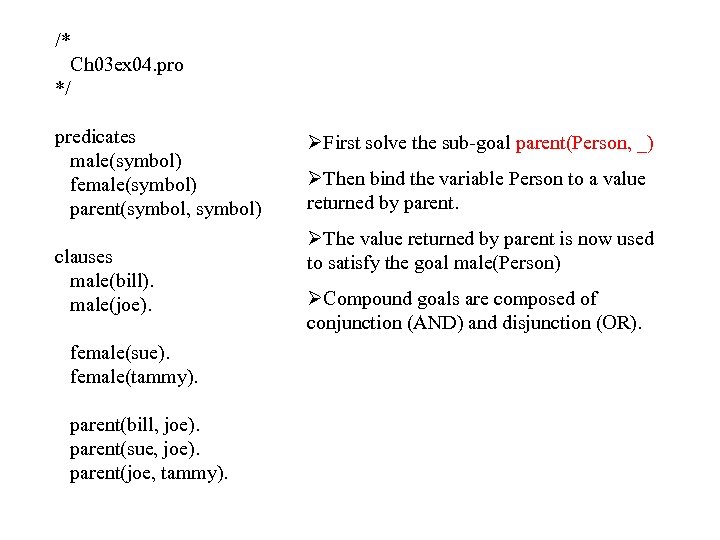 /* Ch 03 ex 04. pro */ predicates male(symbol) female(symbol) parent(symbol, symbol) clauses male(bill). male(joe). female(sue). female(tammy). parent(bill, joe). parent(sue, joe). parent(joe, tammy). ØFirst solve the sub-goal parent(Person, _) ØThen bind the variable Person to a value returned by parent. ØThe value returned by parent is now used to satisfy the goal male(Person) ØCompound goals are composed of conjunction (AND) and disjunction (OR).