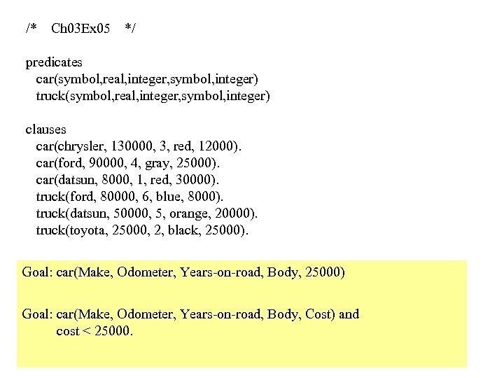 /* Ch 03 Ex 05 */ predicates car(symbol, real, integer, symbol, integer) truck(symbol, real, integer, symbol, integer) clauses car(chrysler, 130000, 3, red, 12000). car(ford, 90000, 4, gray, 25000). car(datsun, 8000, 1, red, 30000). truck(ford, 80000, 6, blue, 8000). truck(datsun, 50000, 5, orange, 20000). truck(toyota, 25000, 2, black, 25000). Goal: car(Make, Odometer, Years-on-road, Body, 25000) Goal: car(Make, Odometer, Years-on-road, Body, Cost) and cost < 25000.