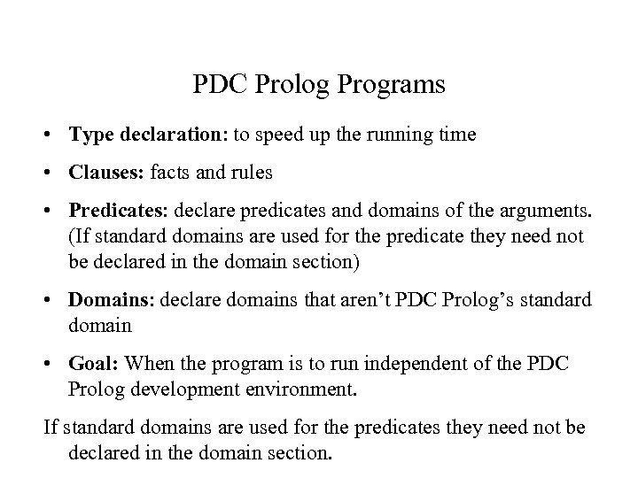 PDC Prolog Programs • Type declaration: to speed up the running time • Clauses: facts and rules • Predicates: declare predicates and domains of the arguments. (If standard domains are used for the predicate they need not be declared in the domain section) • Domains: declare domains that aren’t PDC Prolog’s standard domain • Goal: When the program is to run independent of the PDC Prolog development environment. If standard domains are used for the predicates they need not be declared in the domain section.