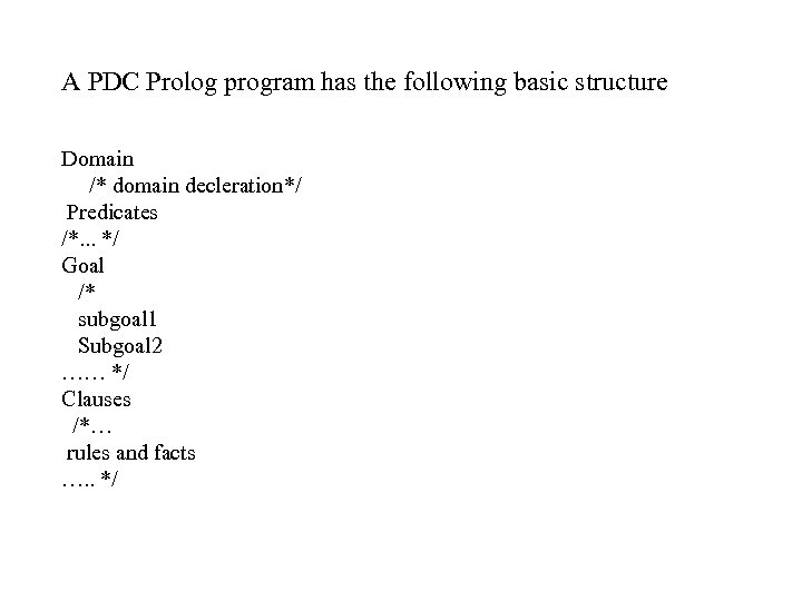 A PDC Prolog program has the following basic structure Domain /* domain decleration*/ Predicates /*. . . */ Goal /* subgoal 1 Subgoal 2 …… */ Clauses /*… rules and facts …. . */