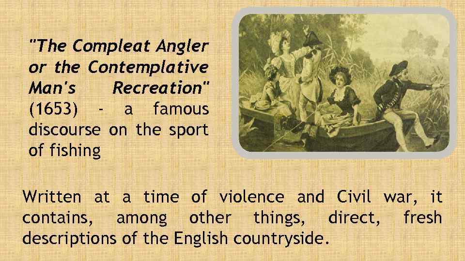 "The Compleat Angler or the Contemplative Man's Recreation" (1653) - a famous discourse on the sport of fishing Written at a time of violence and Civil war, it contains, among other things, direct, fresh descriptions of the English countryside.