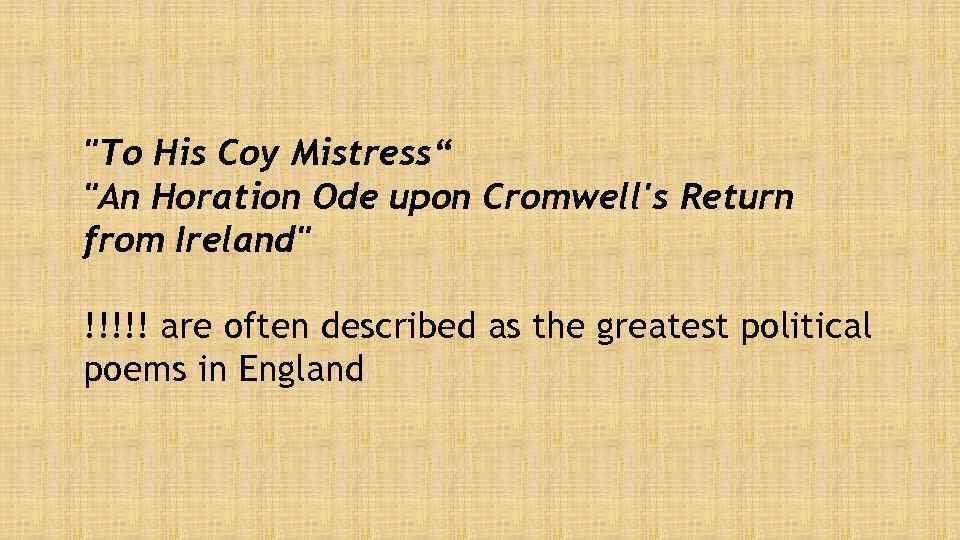 "To His Coy Mistress“ "An Horation Ode upon Cromwell's Return from Ireland" !!!!! are often described as the greatest political poems in England