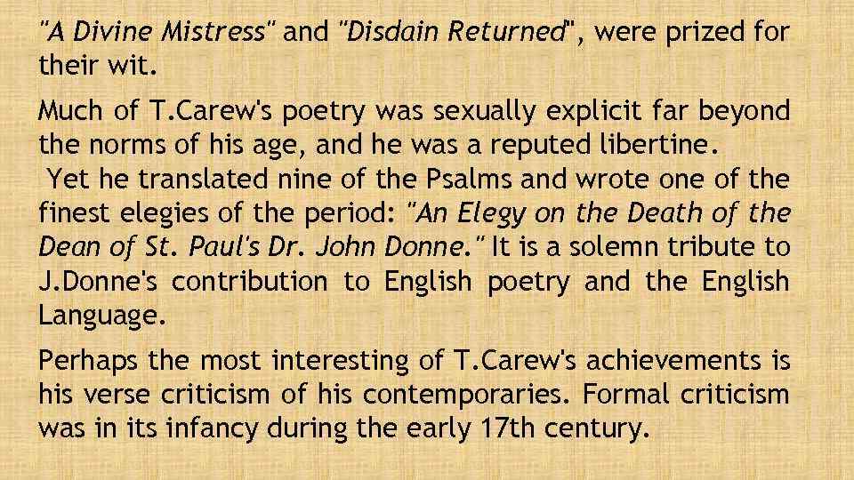 "A Divine Mistress" and "Disdain Returned", were prized for their wit. Much of T. Carew's poetry was sexually explicit far beyond the norms of his age, and he was a reputed libertine. Yet he translated nine of the Psalms and wrote one of the finest elegies of the period: "An Elegy on the Death of the Dean of St. Paul's Dr. John Donne. " It is a solemn tribute to J. Donne's contribution to English poetry and the English Language. Perhaps the most interesting of T. Carew's achievements is his verse criticism of his contemporaries. Formal criticism was in its infancy during the early 17 th century.