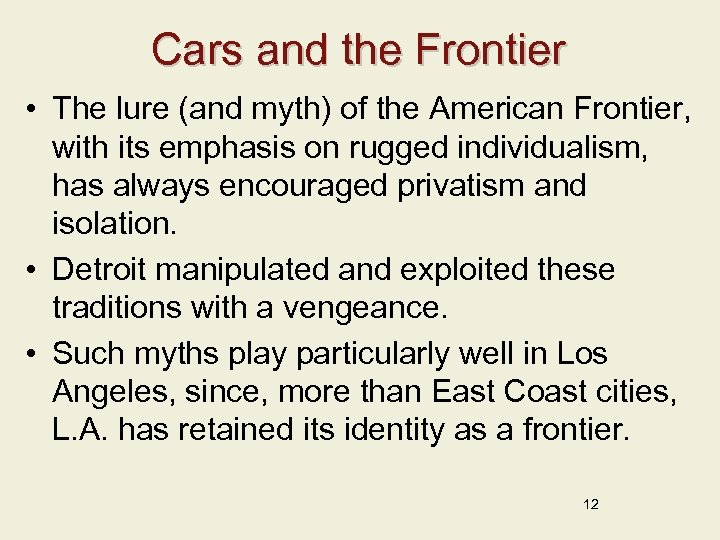 Cars and the Frontier • The lure (and myth) of the American Frontier, with its emphasis on rugged individualism, has always encouraged privatism and isolation. • Detroit manipulated and exploited these traditions with a vengeance. • Such myths play particularly well in Los Angeles, since, more than East Coast cities, L. A. has retained its identity as a frontier. 12