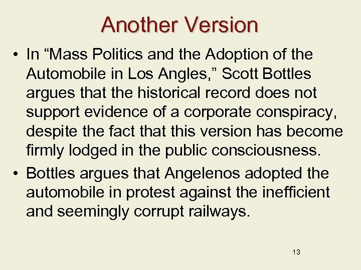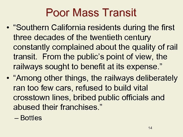 Another Version • In “Mass Politics and the Adoption of the Automobile in Los Angles, ” Scott Bottles argues that the historical record does not support evidence of a corporate conspiracy, despite the fact that this version has become firmly lodged in the public consciousness. • Bottles argues that Angelenos adopted the automobile in protest against the inefficient and seemingly corrupt railways. 13