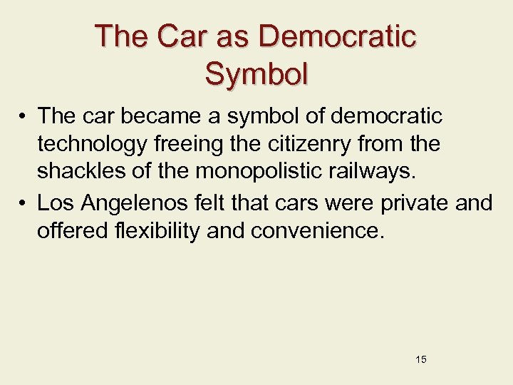 The Car as Democratic Symbol • The car became a symbol of democratic technology freeing the citizenry from the shackles of the monopolistic railways. • Los Angelenos felt that cars were private and offered flexibility and convenience. 15