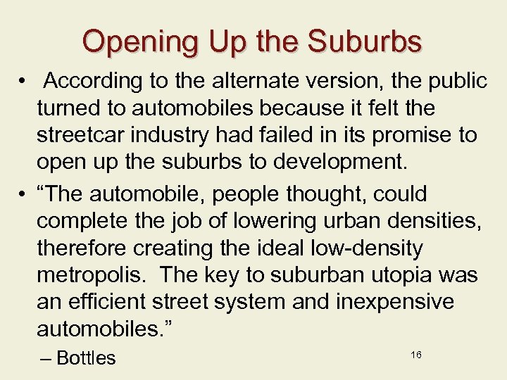 Opening Up the Suburbs • According to the alternate version, the public turned to automobiles because it felt the streetcar industry had failed in its promise to open up the suburbs to development. • “The automobile, people thought, could complete the job of lowering urban densities, therefore creating the ideal low-density metropolis. The key to suburban utopia was an efficient street system and inexpensive automobiles. ” – Bottles 16