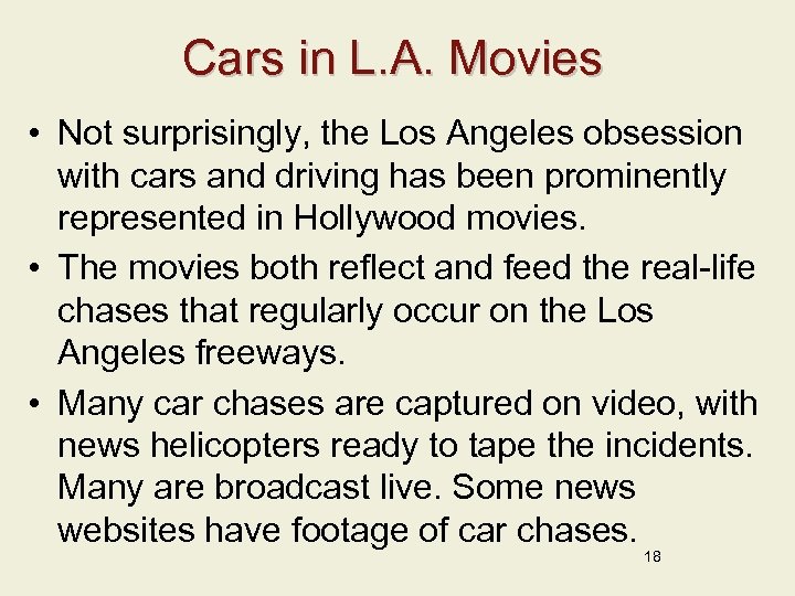 Cars in L. A. Movies • Not surprisingly, the Los Angeles obsession with cars and driving has been prominently represented in Hollywood movies. • The movies both reflect and feed the real-life chases that regularly occur on the Los Angeles freeways. • Many car chases are captured on video, with news helicopters ready to tape the incidents. Many are broadcast live. Some news websites have footage of car chases. 18
