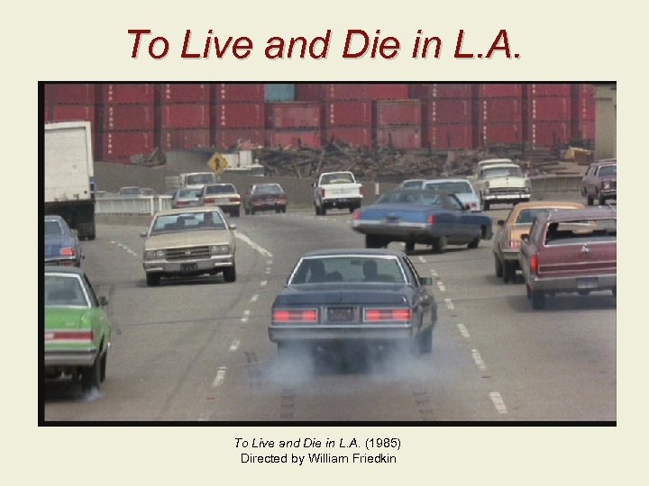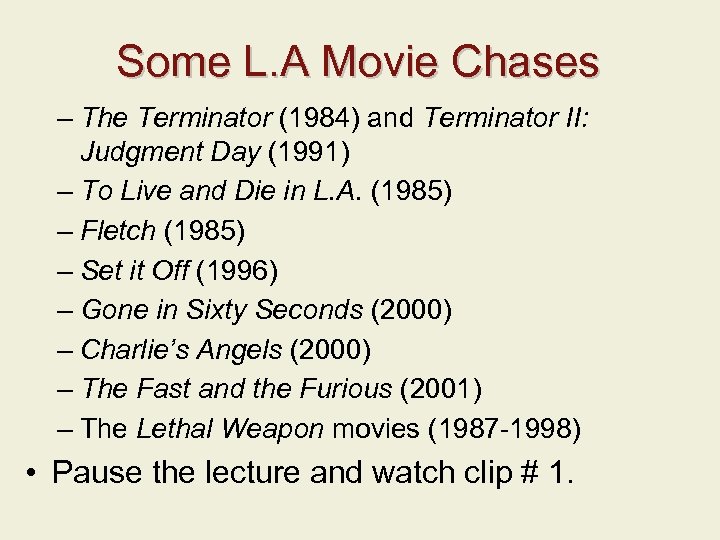 Some L. A Movie Chases – The Terminator (1984) and Terminator II: Judgment Day (1991) – To Live and Die in L. A. (1985) – Fletch (1985) – Set it Off (1996) – Gone in Sixty Seconds (2000) – Charlie’s Angels (2000) – The Fast and the Furious (2001) – The Lethal Weapon movies (1987 -1998) • Pause the lecture and watch clip # 1.