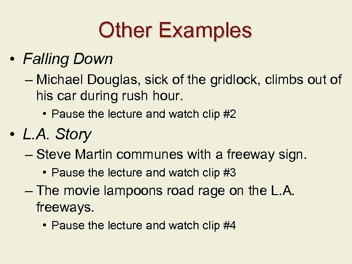Other Examples • Falling Down – Michael Douglas, sick of the gridlock, climbs out of his car during rush hour. • Pause the lecture and watch clip #2 • L. A. Story – Steve Martin communes with a freeway sign. • Pause the lecture and watch clip #3 – The movie lampoons road rage on the L. A. freeways. • Pause the lecture and watch clip #4