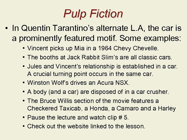 Pulp Fiction • In Quentin Tarantino’s alternate L. A, the car is a prominently featured motif. Some examples: • Vincent picks up Mia in a 1964 Chevy Chevelle. • The booths at Jack Rabbit Slim’s are all classic cars. • Jules and Vincent’s relationship is established in a car. A crucial turning point occurs in the same car. • Winston Wolf’s drives an Acura NSX. • A body (and a car) are disposed of in a car crusher. • The Bruce Willis section of the movie features a Checkered Taxicab, a Honda, a Camaro and a Harley • Pause the lecture and watch clip # 5. • Check out the website linked to the lesson.