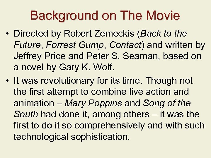 Background on The Movie • Directed by Robert Zemeckis (Back to the Future, Forrest Gump, Contact) and written by Jeffrey Price and Peter S. Seaman, based on a novel by Gary K. Wolf. • It was revolutionary for its time. Though not the first attempt to combine live action and animation – Mary Poppins and Song of the South had done it, among others – it was the first to do it so comprehensively and with such technological sophistication.