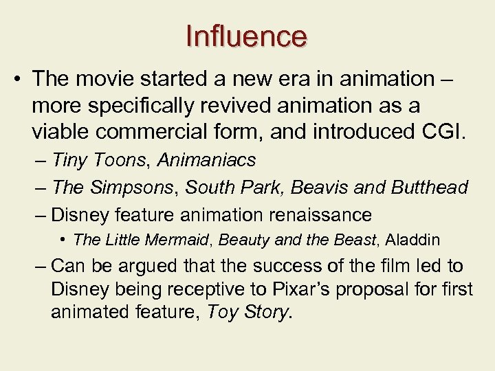 Influence • The movie started a new era in animation – more specifically revived animation as a viable commercial form, and introduced CGI. – Tiny Toons, Animaniacs – The Simpsons, South Park, Beavis and Butthead – Disney feature animation renaissance • The Little Mermaid, Beauty and the Beast, Aladdin – Can be argued that the success of the film led to Disney being receptive to Pixar’s proposal for first animated feature, Toy Story.