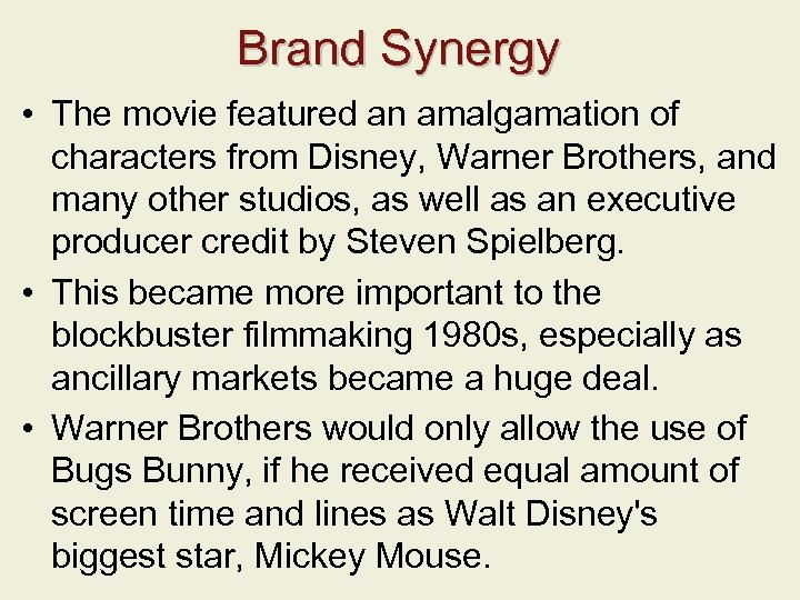 Brand Synergy • The movie featured an amalgamation of characters from Disney, Warner Brothers, and many other studios, as well as an executive producer credit by Steven Spielberg. • This became more important to the blockbuster filmmaking 1980 s, especially as ancillary markets became a huge deal. • Warner Brothers would only allow the use of Bugs Bunny, if he received equal amount of screen time and lines as Walt Disney's biggest star, Mickey Mouse.