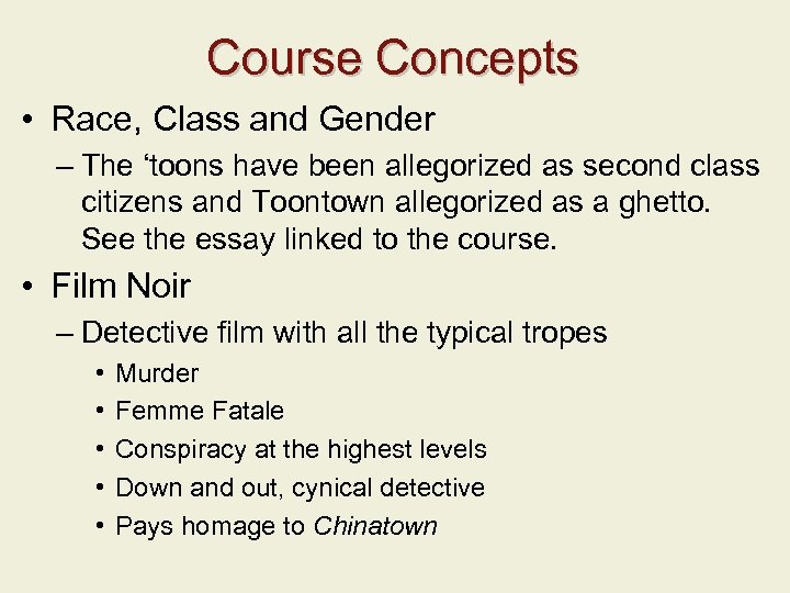 Course Concepts • Race, Class and Gender – The ‘toons have been allegorized as second class citizens and Toontown allegorized as a ghetto. See the essay linked to the course. • Film Noir – Detective film with all the typical tropes • • • Murder Femme Fatale Conspiracy at the highest levels Down and out, cynical detective Pays homage to Chinatown