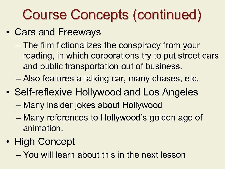 Course Concepts (continued) • Cars and Freeways – The film fictionalizes the conspiracy from your reading, in which corporations try to put street cars and public transportation out of business. – Also features a talking car, many chases, etc. • Self-reflexive Hollywood and Los Angeles – Many insider jokes about Hollywood – Many references to Hollywood’s golden age of animation. • High Concept – You will learn about this in the next lesson