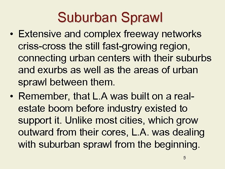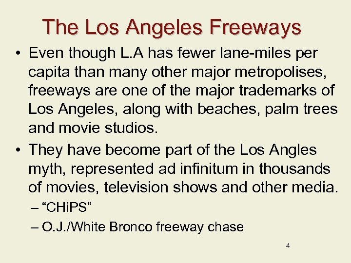 The Los Angeles Freeways • Even though L. A has fewer lane-miles per capita than many other major metropolises, freeways are one of the major trademarks of Los Angeles, along with beaches, palm trees and movie studios. • They have become part of the Los Angles myth, represented ad infinitum in thousands of movies, television shows and other media. – “CHi. PS” – O. J. /White Bronco freeway chase 4