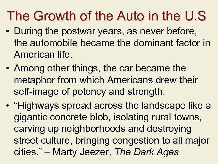 The Growth of the Auto in the U. S • During the postwar years, as never before, the automobile became the dominant factor in American life. • Among other things, the car became the metaphor from which Americans drew their self-image of potency and strength. • “Highways spread across the landscape like a gigantic concrete blob, isolating rural towns, carving up neighborhoods and destroying street culture, bringing congestion to all major cities. ” – Marty Jeezer, The Dark Ages