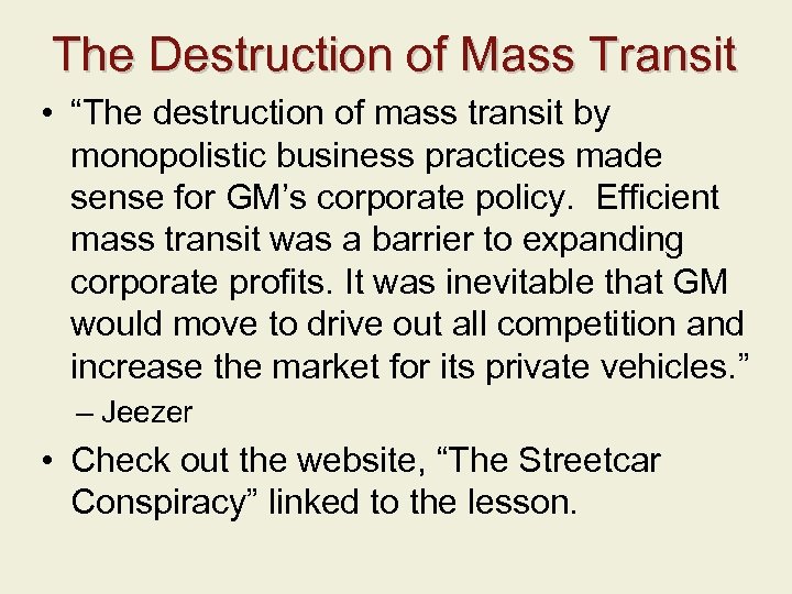 The Destruction of Mass Transit • “The destruction of mass transit by monopolistic business practices made sense for GM’s corporate policy. Efficient mass transit was a barrier to expanding corporate profits. It was inevitable that GM would move to drive out all competition and increase the market for its private vehicles. ” – Jeezer • Check out the website, “The Streetcar Conspiracy” linked to the lesson.