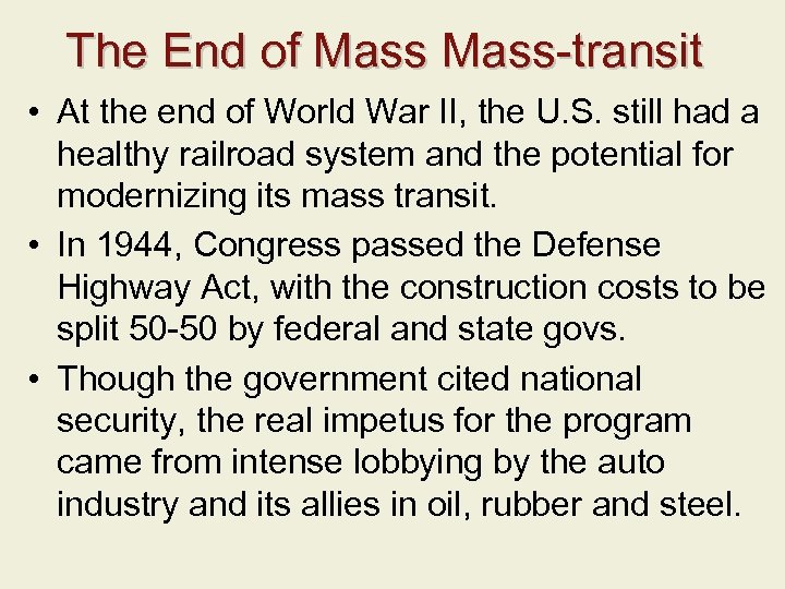 The End of Mass-transit • At the end of World War II, the U. S. still had a healthy railroad system and the potential for modernizing its mass transit. • In 1944, Congress passed the Defense Highway Act, with the construction costs to be split 50 -50 by federal and state govs. • Though the government cited national security, the real impetus for the program came from intense lobbying by the auto industry and its allies in oil, rubber and steel.