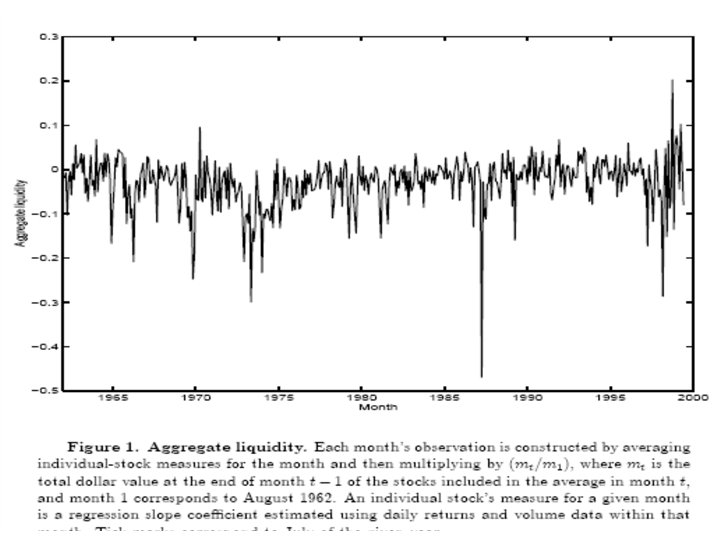 Effects of liquidity over time Q: Does a change in the liquidity of a security affect its value? (the security's "fundamentals" remain unchanged) • Amihud, Mendelson and Wood (1990): Event study (Oct 1987 Crash. ) • Re-evaluation of market liquidity in the week before the crash. • Sharp declines when program trading kicked in. • Liquidity lower than previously thought → lower stock value. Findings: - Stocks whose liquidity declined more suffered greater price declines. - Stocks whose liquidity recovered more by October-end had greater price increase.