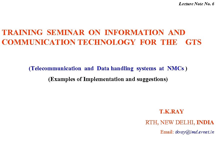 Lecture Note No. 6 TRAINING SEMINAR ON INFORMATION AND COMMUNICATION TECHNOLOGY FOR THE GTS (Telecommunication and Data handling systems at NMCs ) (Examples of Implementation and suggestions) T. K. RAY RTH, NEW DELHI, INDIA Email: tkray@imd. ernet. in
