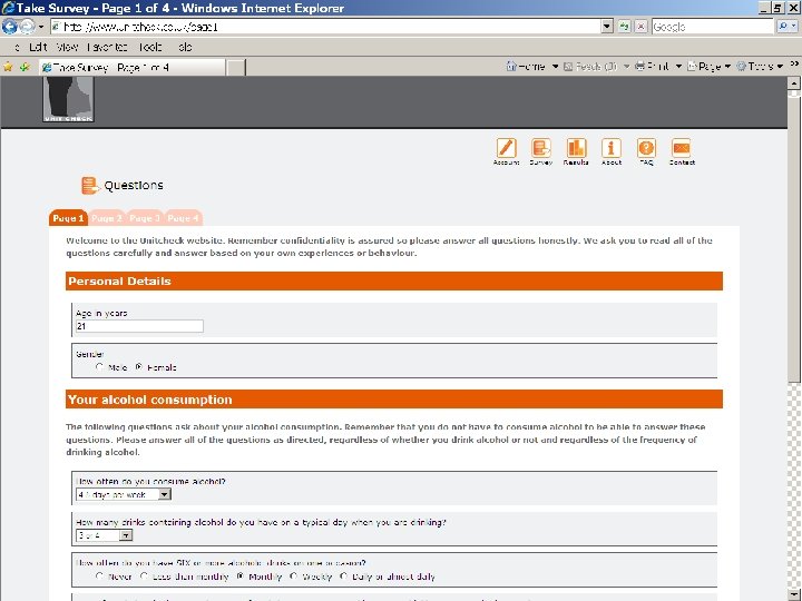 Leeds Institute of Health Sciences Academic Unit of Psychiatry and Behavioural Sciences Unitcheck: Complex intervention Screening and brief intervention (instant personalised feedback) that included information informed by the social norms approach