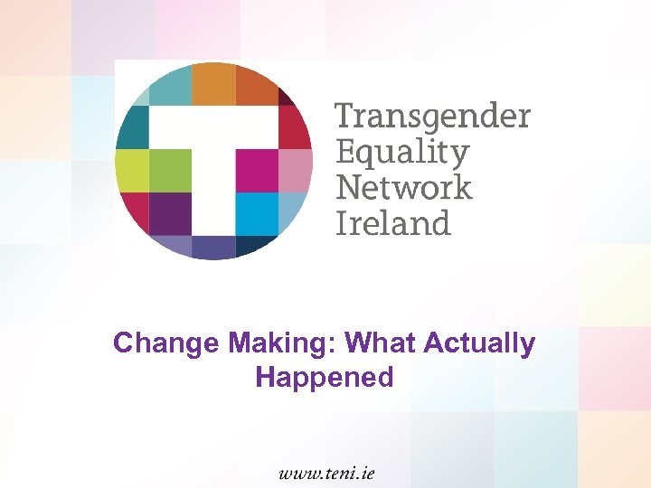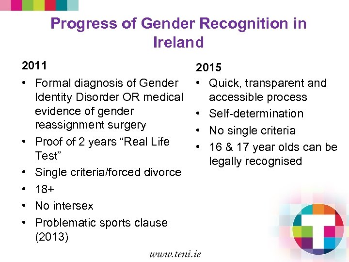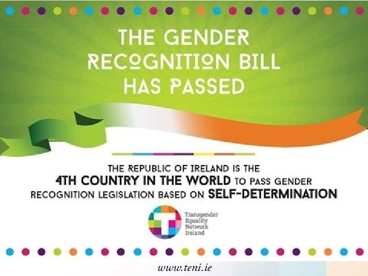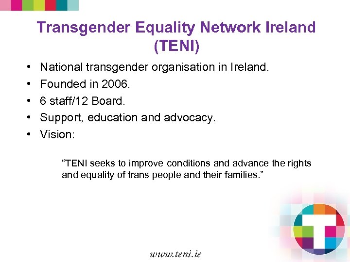Transgender Equality Network Ireland (TENI) • • • National transgender organisation in Ireland. Founded in 2006. 6 staff/12 Board. Support, education and advocacy. Vision: “TENI seeks to improve conditions and advance the rights and equality of trans people and their families. ”