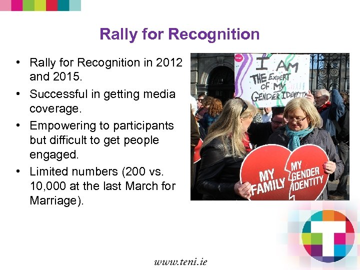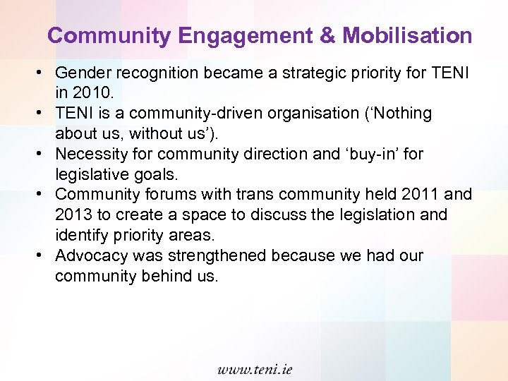 Community Engagement & Mobilisation • Gender recognition became a strategic priority for TENI in 2010. • TENI is a community-driven organisation (‘Nothing about us, without us’). • Necessity for community direction and ‘buy-in’ for legislative goals. • Community forums with trans community held 2011 and 2013 to create a space to discuss the legislation and identify priority areas. • Advocacy was strengthened because we had our community behind us.
