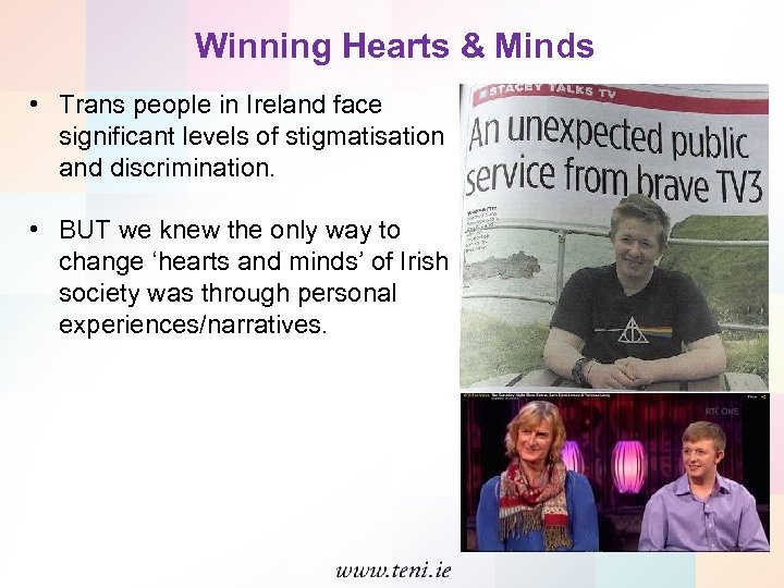 Winning Hearts & Minds • Trans people in Ireland face significant levels of stigmatisation and discrimination. • BUT we knew the only way to change ‘hearts and minds’ of Irish society was through personal experiences/narratives.