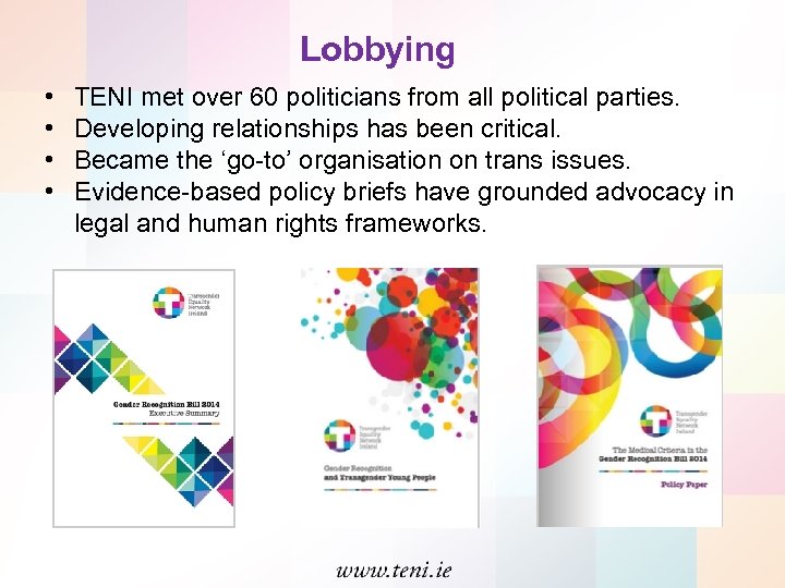 Lobbying • • TENI met over 60 politicians from all political parties. Developing relationships has been critical. Became the ‘go-to’ organisation on trans issues. Evidence-based policy briefs have grounded advocacy in legal and human rights frameworks.