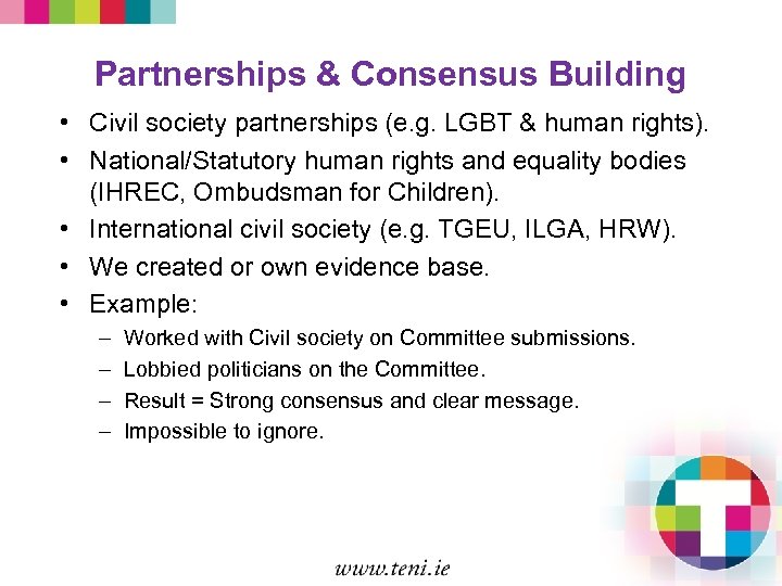 Partnerships & Consensus Building • Civil society partnerships (e. g. LGBT & human rights). • National/Statutory human rights and equality bodies (IHREC, Ombudsman for Children). • International civil society (e. g. TGEU, ILGA, HRW). • We created or own evidence base. • Example: – – Worked with Civil society on Committee submissions. Lobbied politicians on the Committee. Result = Strong consensus and clear message. Impossible to ignore.