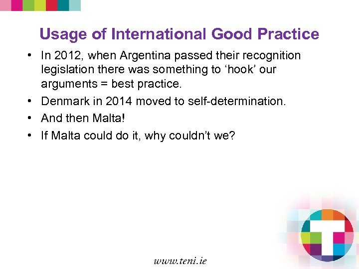 Usage of International Good Practice • In 2012, when Argentina passed their recognition legislation there was something to ‘hook’ our arguments = best practice. • Denmark in 2014 moved to self-determination. • And then Malta! • If Malta could do it, why couldn’t we?
