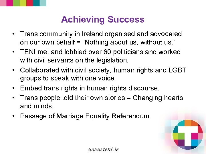 Achieving Success • Trans community in Ireland organised and advocated on our own behalf = “Nothing about us, without us. ” • TENI met and lobbied over 60 politicians and worked with civil servants on the legislation. • Collaborated with civil society, human rights and LGBT groups to speak with one voice. • Embed trans rights in human rights discourse. • Trans people told their own stories = Changing hearts and minds. • Passage of Marriage Equality Referendum.