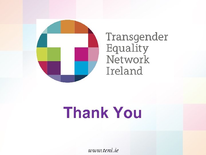 What’s Next? • Over 130 people legally recognised in past 9 months. • 3 people between the ages of 16 &17. • In 2017, the Irish Government will review the legislation, TENI is campaigning to: – Ensure young trans people under 16 will be legally recognised. – Explore meaningful inclusion of intersex experiences in law. – Provide non-binary identity recognition (X or other designation).