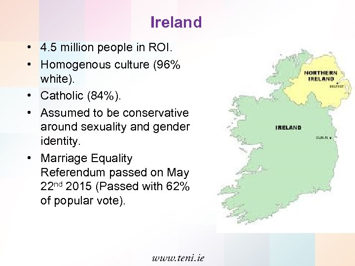 Ireland • 4. 5 million people in ROI. • Homogenous culture (96% white). • Catholic (84%). • Assumed to be conservative around sexuality and gender identity. • Marriage Equality Referendum passed on May 22 nd 2015 (Passed with 62% of popular vote).