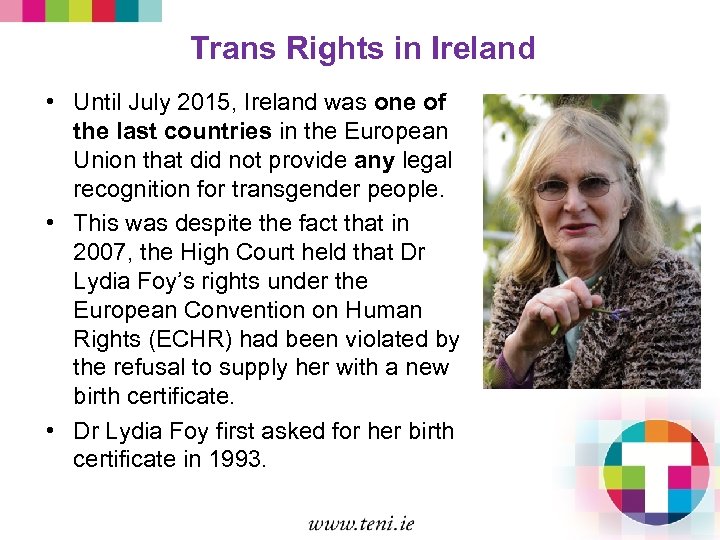 Trans Rights in Ireland • Until July 2015, Ireland was one of the last countries in the European Union that did not provide any legal recognition for transgender people. • This was despite the fact that in 2007, the High Court held that Dr Lydia Foy’s rights under the European Convention on Human Rights (ECHR) had been violated by the refusal to supply her with a new birth certificate. • Dr Lydia Foy first asked for her birth certificate in 1993.