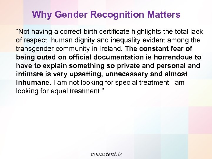 Why Gender Recognition Matters “Not having a correct birth certificate highlights the total lack of respect, human dignity and inequality evident among the transgender community in Ireland. The constant fear of being outed on official documentation is horrendous to have to explain something so private and personal and intimate is very upsetting, unnecessary and almost inhumane. I am not looking for special treatment I am looking for equal treatment. ”