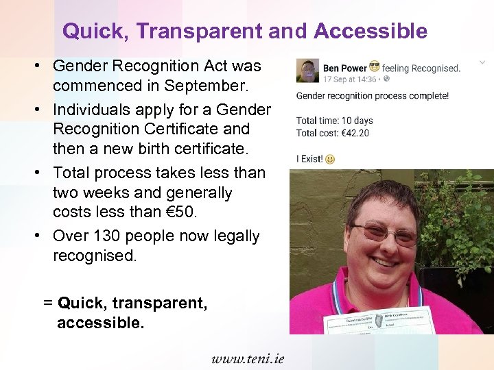 Quick, Transparent and Accessible • Gender Recognition Act was commenced in September. • Individuals apply for a Gender Recognition Certificate and then a new birth certificate. • Total process takes less than two weeks and generally costs less than € 50. • Over 130 people now legally recognised. = Quick, transparent, accessible.